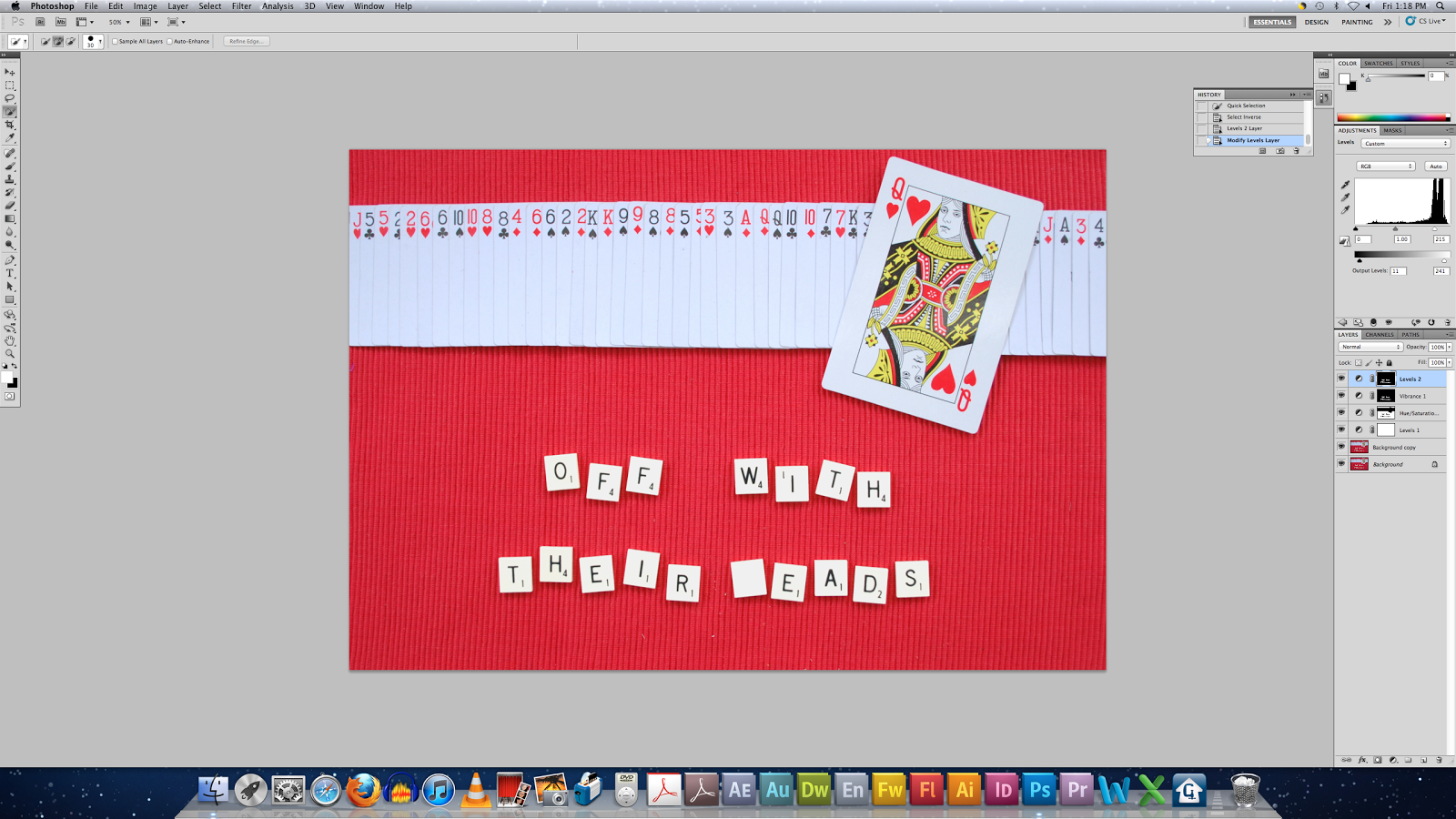 I'm happier with the result of this photograph to that of the last round of editing! The big Queen card makes the Queen stand out more as the focus of the image. And you wouldn't notice her angry face unless you really looked at it, but I know it's there. This needs more worh, with the clone tool particularly because of the dust spots on the mat from the shoot. The cards look a lot better in a straight line and the big card is a quirky feature.